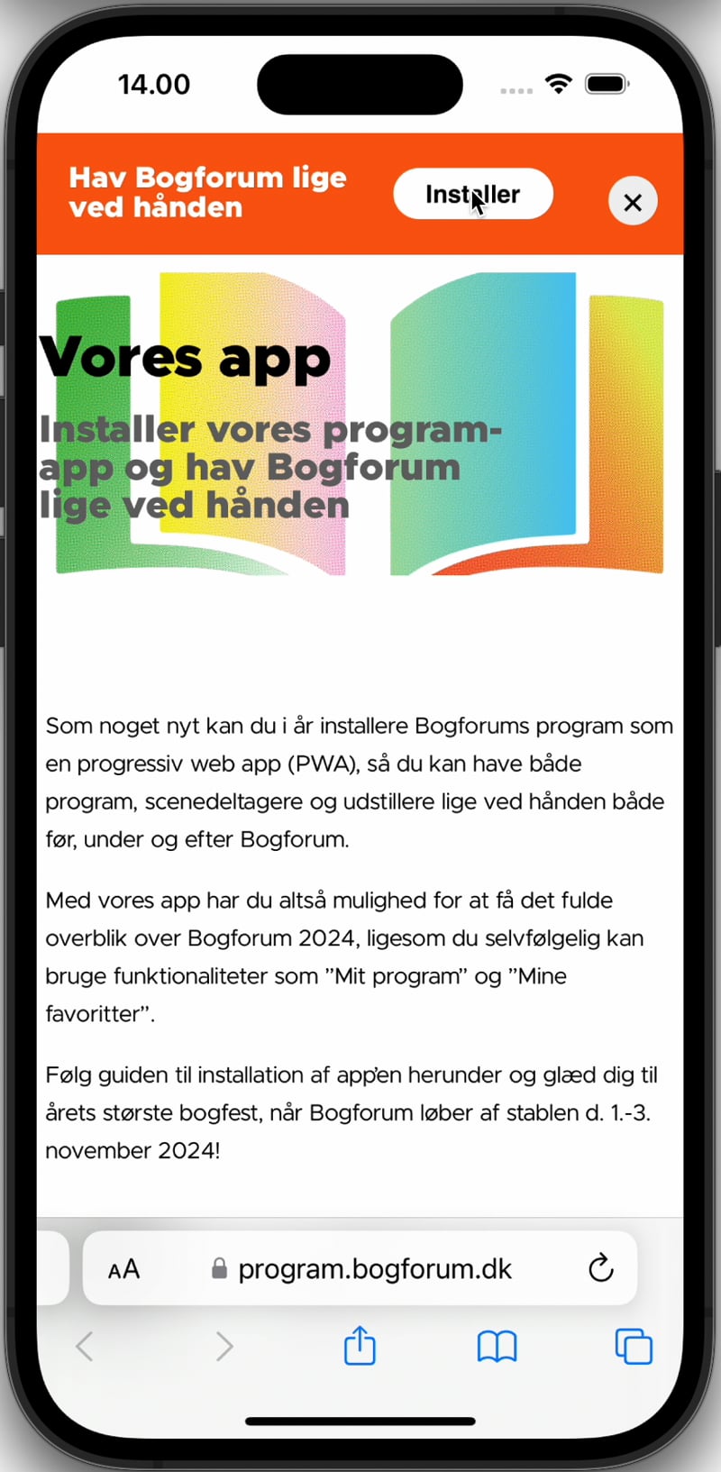 Som noget nyt kan du i år installere Bogforums program som en progressiv web app (PWA), så du kan have både program, scenedeltagere og udstillere lige ved hånden både før, under og efter Bogforum.